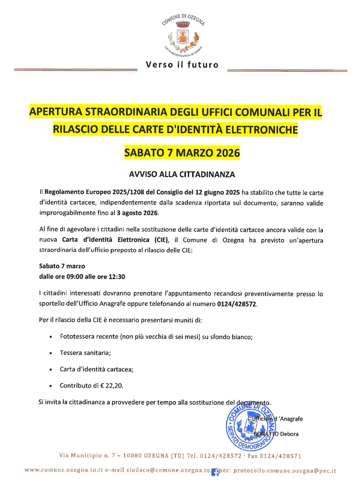 Al fine di agevolare i cittadini nella sostituzione delle carte d’identità cartacee ancora valide con la nuova Carta d’Identità Elettronica (CIE), il Comune di Ozegna ha previsto un’apertura straordinaria dell’ufficio preposto al rilascio delle CIE: