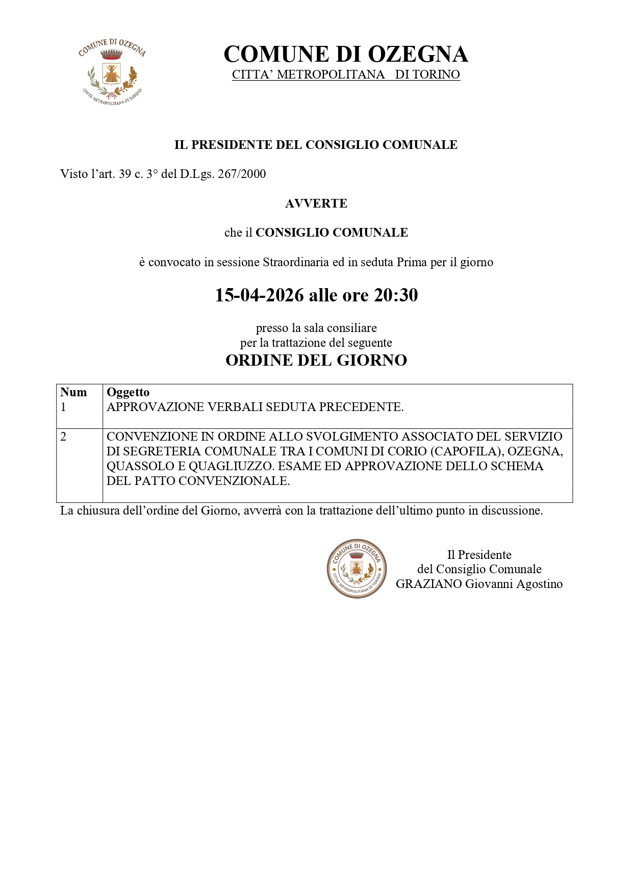 Convocazione Consiglio Comunale 15 aprile 2026 ore 20:30
