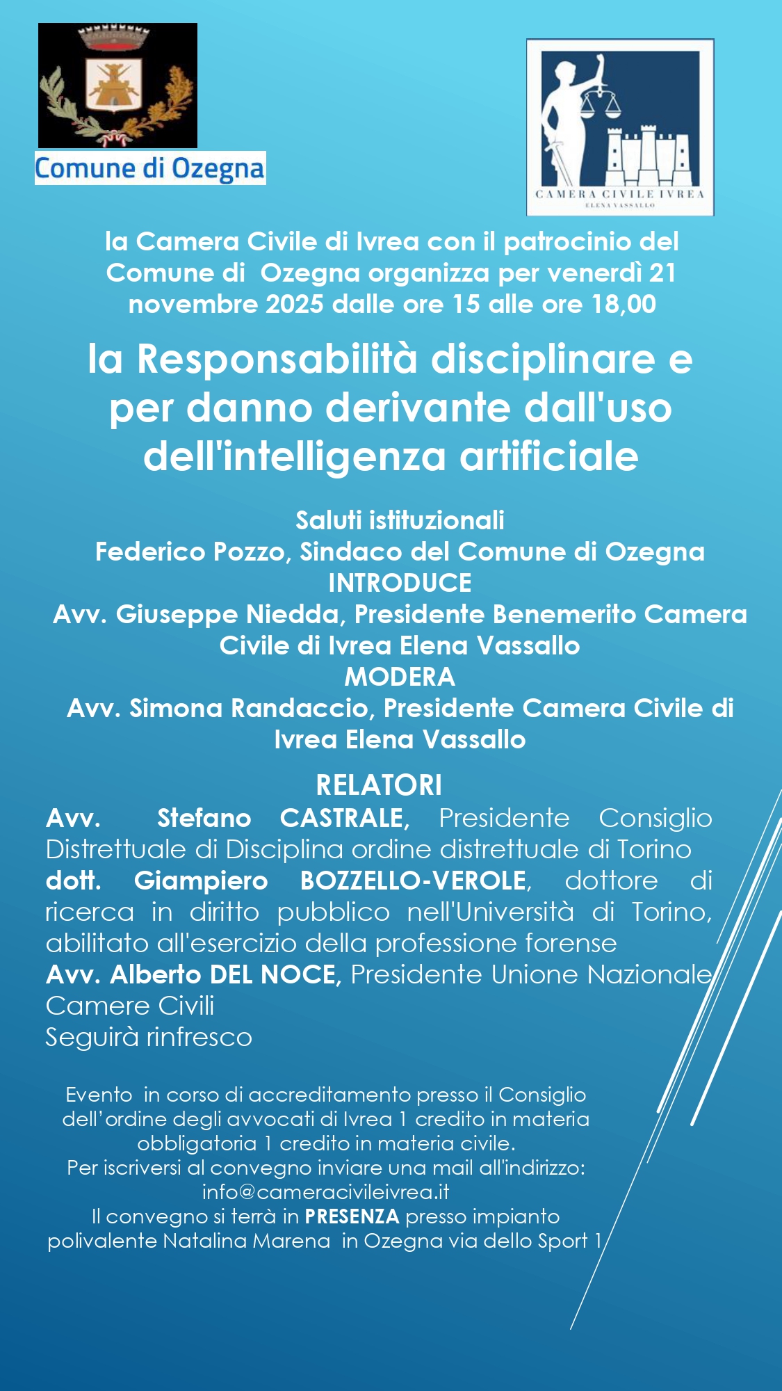 L’iniziativa, organizzata dalla Camera Civile di Ivrea con il patrocinio del nostro Comune, si terrà venerdì 21 novembre 2025, dalle 15:00 alle 18:00, presso l’impianto polivalente Natalina Marena, in via dello Sport 1, Ozegna.